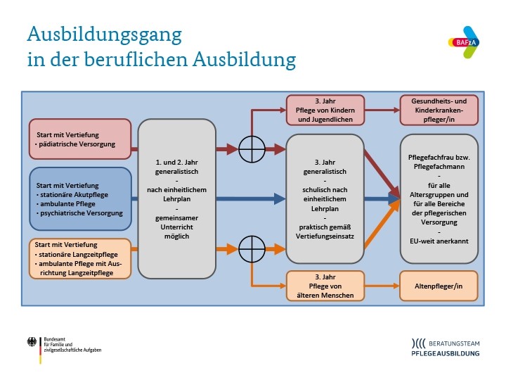 Anhand der folgenden Grafik des Beratungsteams Pflegeausbildung des Bundesamtes für Familie und bundesgesellschaftliche Aufgaben ist diese Struktur dargestellt:
